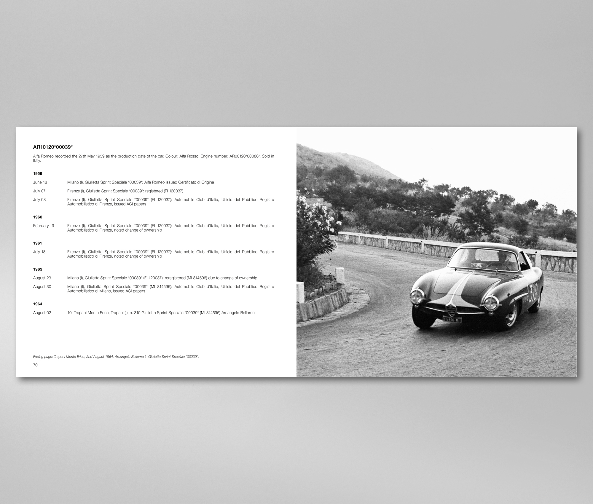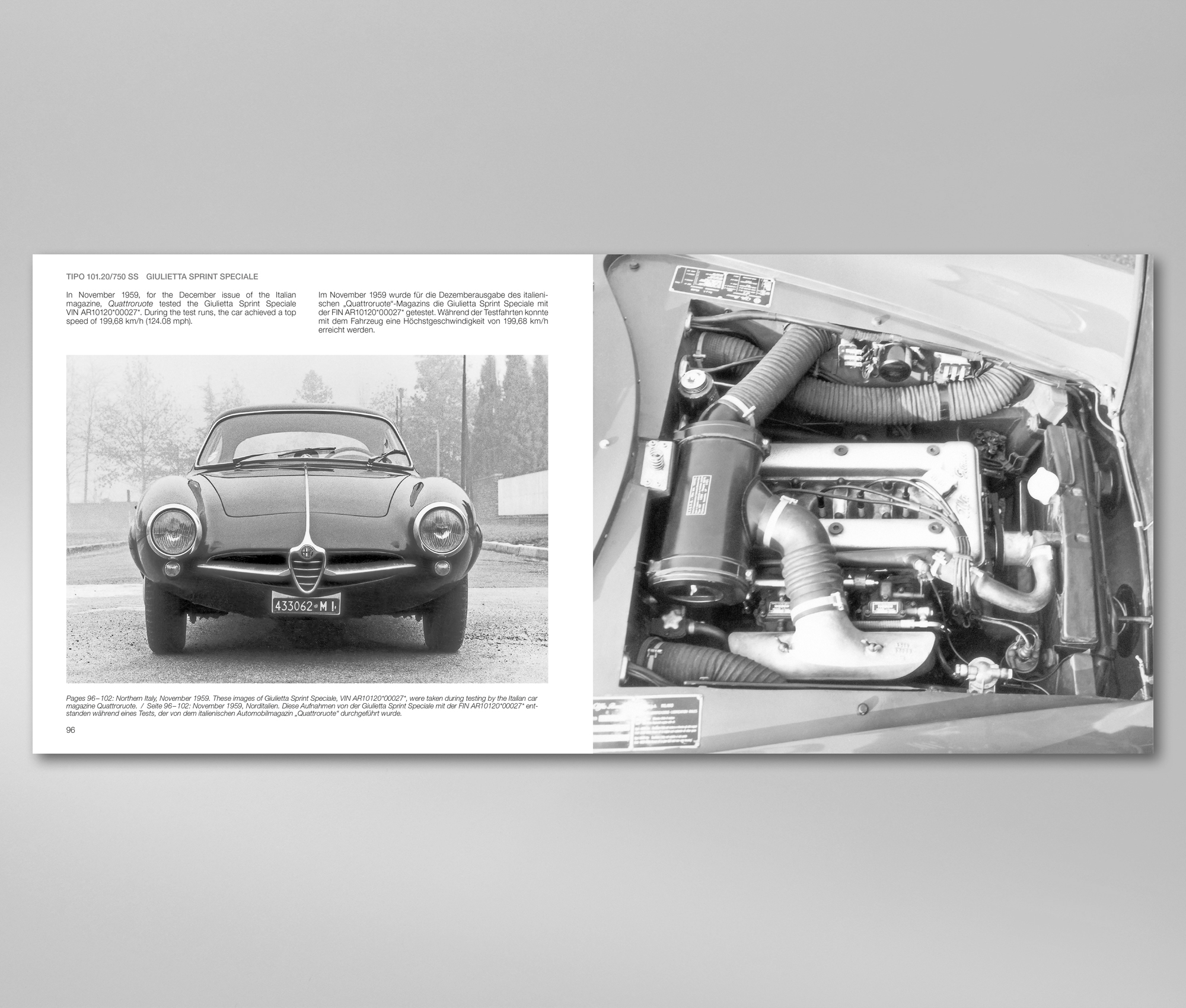 Der zweite Band ist ein vollständiges Register der ersten 101 gebauten Giulietta Sprint Speciale sowie von Fahrzeugen mit nachgewiesener Renngeschichte.
