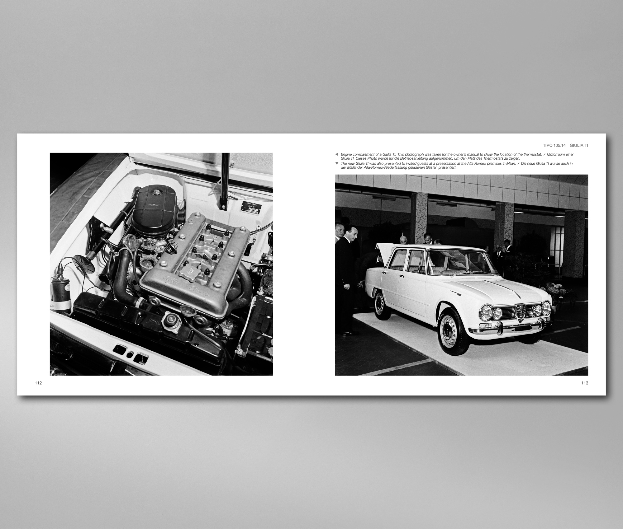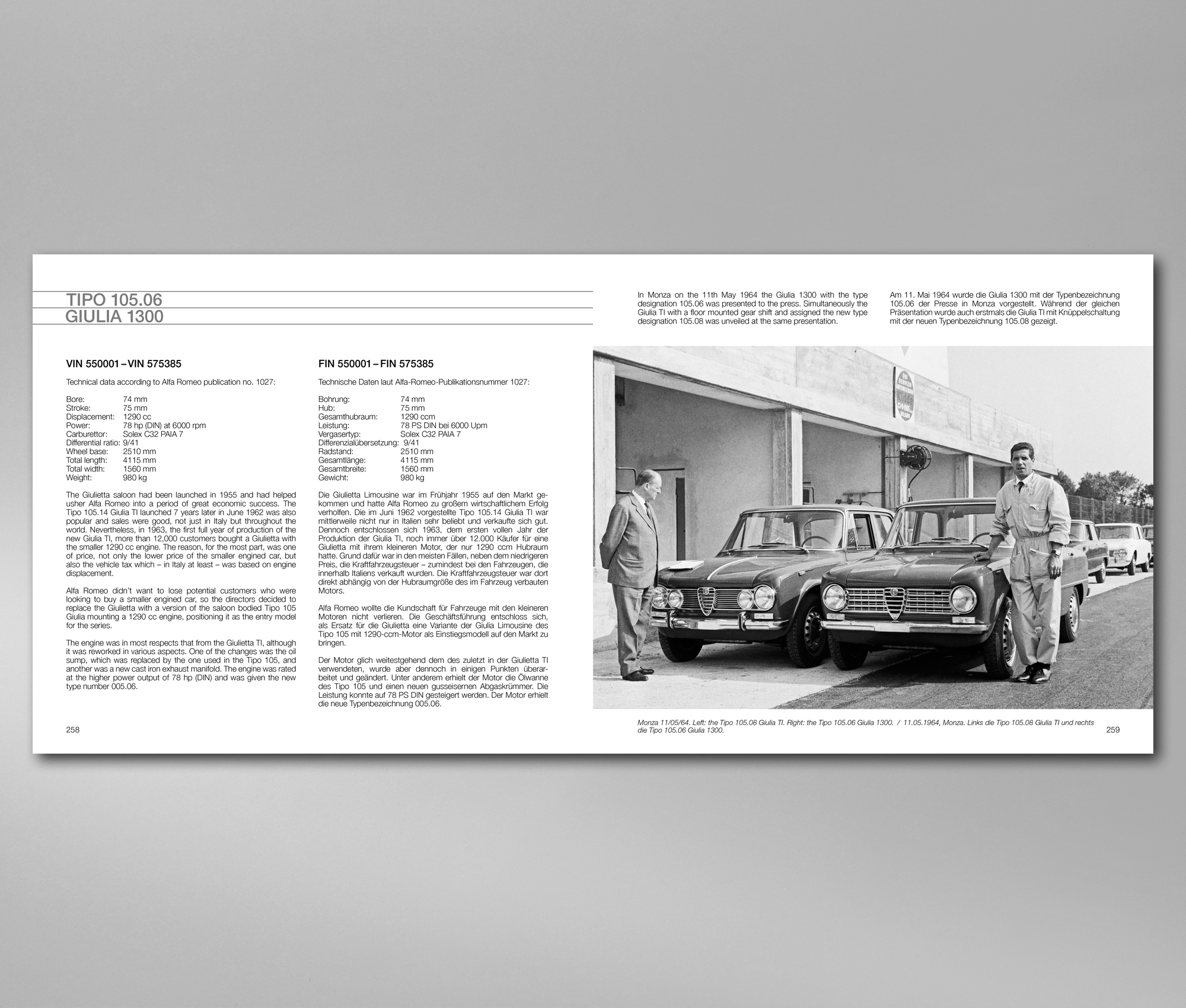 Auf 528 Seiten werden mit ausnahmslos zeitgenössischen, überwiegend noch nie veröffentlichten Photos die verschiedenen Modelle dieses Typs, die bei Alfa Romeo in den Jahren 1962 bis 1977 in Portello und Arese vom Band gelaufen sind, dokumentiert: