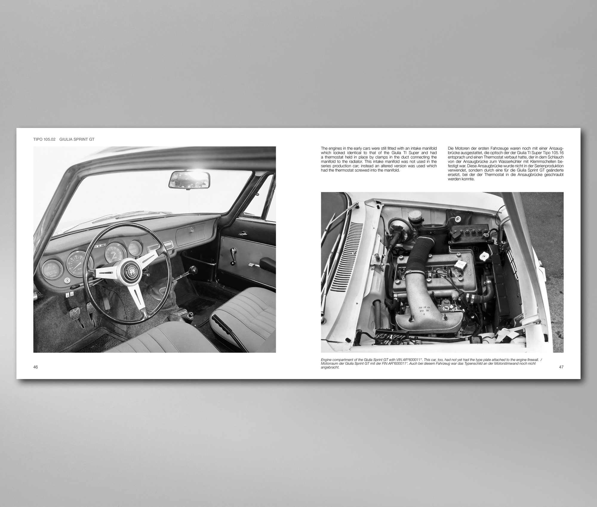 Alle sechs Bände sind zweisprachig in Englisch und Deutsch verfasst und hervorragend verarbeitet. Druck und Bildreproduktion erfolgen auf hochwertigem Mattglanzpapier in bester Qualität. Die Illustration des gesamten Buchwerks ist schlicht gigantisch. 2019 Fotos auf über 2200 Seiten lassen keinen Aspekt der Modellentwicklung der diversen Giulia-Baureihen unberücksichtigt. Es handelt sich ausschließlich um zeitgenössische Fotos aus den 1960er und 1970er Jahren, die ein unglaubliches Maß an Authentizität vermitteln. Dementsprechend überwiegen die Schwarzweiß-Aufnahmen, von denen ohnehin ein ganz besonderer Reiz ausgeht. Es ist deshalb auch kein bedeutender Mangel, dass einige der Farbfotos – offenbar bedingt durch ihr Alter – etwas rotstichig sind. Die Abbildungen sind zum großen Teil im ganzseitigen Querformat gehalten und spiegeln nicht nur den optischen Reiz der Alfa Romeo wider, sondern beleuchten auch sämtliche technische Details in einer Vielfalt und Genauigkeit, die ihresgleichen sucht. Ob Kühlergrill oder Kofferraum, ob Motorblock oder Unterboden, ob Armaturenbrett oder Türverkleidung, ob Bremsen, Rückbank, Pedalerie oder Vordersitze – praktisch alle wesentlichen und somit zur Unterscheidung der Baureihen geeigneten Merkmale werden erkennbar gemacht. Immer wieder begeistern natürlich die Aufnahmen, die die ausnahmslos optisch so reizvollen Alfa in ihrer Gesamtansicht vor abwechslungsreichen Hintergründen zeigen – auf Ausstellungen, in Landschaften eingebettet oder einfach auf dem Werksgelände.