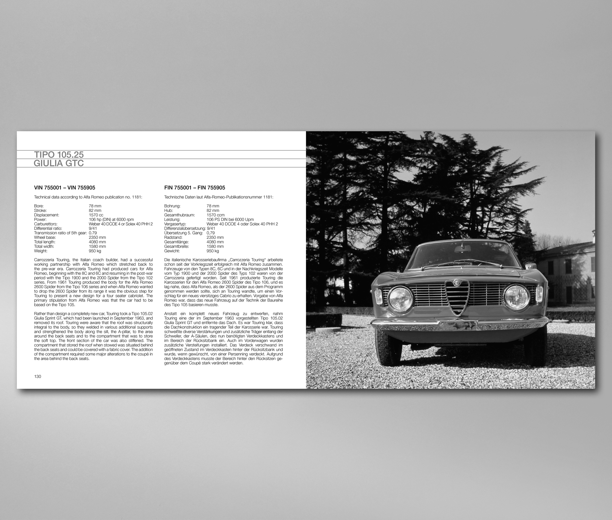 Aber natürlich sind die fünf Bände über die verschiedenen Modelle der Baureihe 105 keine reinen Bildbände. Es werden alle Stufen der Modellentwicklung detailliert beschrieben, alle technischen Daten festgehalten und zum großen Teil auch die technischen Überlegungen, die den Entwicklungen zugrunde lagen, dargestellt. Hierbei muss man berücksichtigen, dass diese Automobilhistorie nun rund 50 Jahre zurückliegt, so dass es umso bemerkenswerter ist, dass der Autor nicht zuletzt dank der Unterstützung von Alfa Romeo derartig viel technische Einzelheiten und Entwicklungswissen zusammentragen konnte.