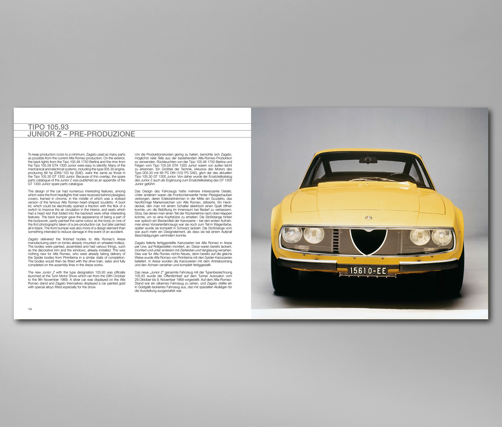 Es folgte eine kleine Vorserie mit vermutlich zwei Fahrzeugen, die sich nur noch in wenigen Details vom späteren käuflich zu erwerbenden Fahrzeug unterschieden. Zagato hatte bei der Realisierung des Junior Z viele vorhandene Teile von anderen Alfa Romeo-Modellen verwendet um die Kosten möglichst gering zu halten. So stammten die Rückleuchten vom 1750 Berlina und die Felgen vom GTA 1300 Junior. Viele technische Komponenten stammten vom GT 1300 Junior und so war der Ersatzteilkatalog des Junior Z tatsächlich nur einen Ergänzung zum bestehenden Katalog des GT 1300 Junior. Dennoch hatte der Junior Z noch viele beeindruckende optische Finessen zu bieten, allen voran natürlich die Front aus Plexiglas mit dahinter verborgenen Scheinwerfern. Auch das Scudetto wurde hier geschickt integriert. In schon erstaunlich vielen Bilder der Vorserien-Fahrzeugen lassen sich dann unzählige Details entdecken und auch die Außenaufnahmen können überzeugen. Dieses führen den Leser bis zur offiziellen Präsentation des Modells auf dem Turnier Autosalon im Jahr 1969. Hier fanden sich gleich zwei Modelle auf den Ständen von Alfa Romeo und Zagato wieder. Die ersten Junior Z der Serienproduktion folgen dann im nächsten Kapitel und zeigen auch einen direkten Blick in die Produktion. Auch die technischen Daten des mit 1290 ccm Hubraum ausgestatteten Modells finden sich hier wieder. Da die 103 PS auf nur 970 kg Gewicht stießen waren die Fahrleistungen durchaus sportlich. Bei den Bildern finden sich dann schon erstaunlich viele Farbaufnahmen wieder, welche auch unterschiedlichste Farben des Junior Z zeigen können.