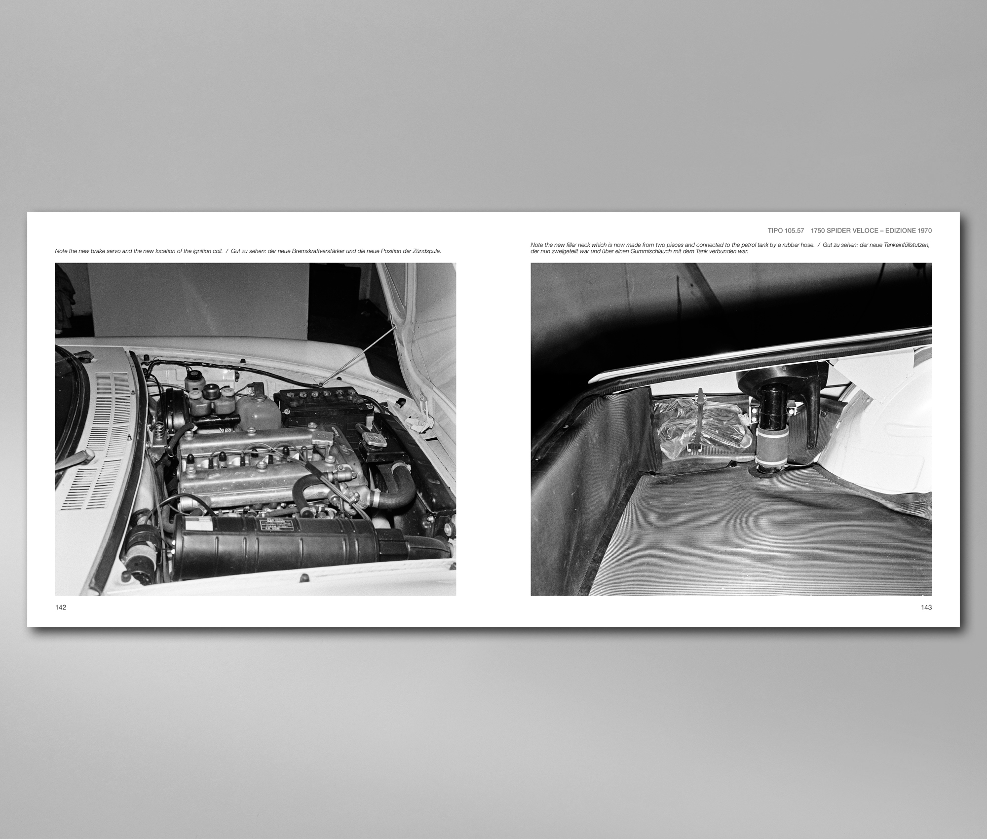 Der Tipo 105.03 ist schließlich das erste Modell, welches im Buch konkret beschrieben und gezeigt wird. Zunächst Blick das Buch aber auf das Vorserienfahrzeug mit dem Alfa Romeo schon 1965 erste Test auf dem firmeneigenen Testgelände in Balocco durchführte. Schon das erste Bild zeigt einen halbseitig mit Fäden beklebten Spider. Hiermit wollte die Ingenieure die Verwirbelungen erkennen um ggf. noch in Details nachzubessern. Allein dieser Test wird mit fünf Bilder dargestellt, die allesamt im großen Format abgebildet werden. Neben den interessanten Fahraufnahmen von hinten und vorne zeigen sich auch zwei Detailaufnahmen. Anhand dieser lassen sich Kleinigkeiten entdecken, bei denen dieses Fahrzeug noch nicht der späteren Serie entsprach. Dies war natürlich keinesfalls ungewöhnlich, aber der Autor deckt alle Details hierzu auf und listet diese im Text dazu auch akribisch auf. Dies gilt vor allem für das zweite Vorserien-Fahrzeug, von dem sogar die Chassis-Nummer bekannt ist. Von AR*660007* wurden erstaunlich viele Aufnahmen gemacht, von denen sich viele im Buch wieder finden. So nutzte man dieses zweite Fahrzeug auch für die Aufnahme der technischen Dokumentation und kann viele viele Details entdecken. Ob ein Blick in den Kofferraum, das Wechseln eine Glühbirne oder diverse technische Details. Nichts bleibt verborgen.