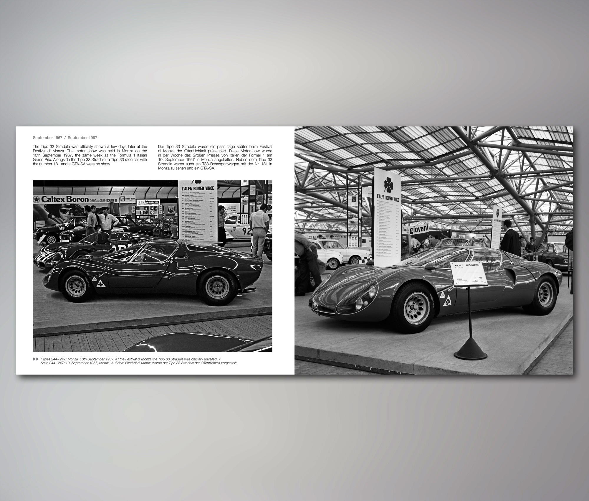 Ein ausführliches Vorwort stammt von Dott. Ing. Gherardo Severi, der nach langjährigen Erfahrungen bei Maserati und Porsche 1967 in die unter der Leitung von Carlo Chiti und Giuseppe Busso stehende Mannschaft von Autodelta eintrat, um bei der Bewältigung der unübersehbaren Probleme in der Entwicklung des Tipo 33 mitzuwirken. Die Einleitung befasst sich mit der Entstehung von Auto-Delta als Motorsportabteilung des damals staatlichen Unternehmens Alfa Romeo, streift kurz die Rennhistorie der TZ-Rennsportwagen und geht dann auf die 1964 entwickelten und 1965 entstandenen ersten Prototypen zum Tipo 33 ein Anschließend werden chronologisch alle Stationen der Saison 1967 dokumentiert: von den Testfahrten in Monza und auf der werkseigenen Teststrecke von Balocco, über die Einsätze bei den bekannten Langstreckenrennen wie den 12 Stunden von Sebring, der Targa Florio, den 1000 km am Nürburgring bis zu zahlreichen Bergrennen und italienischen Sportwagenläufen in Mugello und Vallelunga sowie den Testfahrten für die 24 Stunden von Daytona 1968. Dazu kommen eine bis ins Detail gehende Darstellung der Entwicklung der Straßenversion Tipo 33 Stradale sowie ein Artikel über den bereits 1966 von Giuseppe Busso konstruierten Alfa Romeo OSI Scarabeo. Auch auf die nächste Entwicklungsstufe für das Jahr 1968, den Tipo 33/2 gehen die Autoren ein. Aus den hoch kompetenten, zweisprachig englisch-deutschen Texten wird deutlich, wie weit Dasse und Übelher in die bisher eher verschlossene Materie eindringen konnten und mit welch tiefgehender Recherche sie interessante technische aber auch einsatzstrategische Details zu Tage förderten.