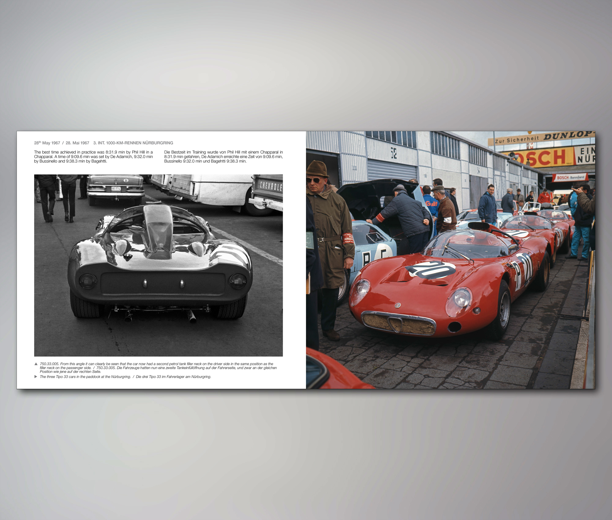 Hellhörig wurden wir, als der Dingwort Verlag ein Werk über den Rennsportwagen Tipo 33 ankündigte, die bisher existierende Literatur ist nicht besonders gründlich. Dasse und sein Co-Autor Martin Übelher standen vor der Überlegung, die gesamte Historie des Tipo 33 in ein Buch zu packen. Die Menge an hochinteressantem Material führte zu dem Entschluss, für jedes Jahr einen Extraband zusammenzustellen, dementsprechend liegt uns jetzt das Jahr 1967 vor, weitere Bände werden folgen. Man kann diese Entscheidung nur begrüßen, denn was hier auf 312 Seiten präsentiert wird, ist einfach nur großartig!